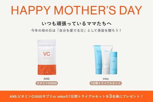 いつも頑張っているママたちのために、母の日は「自分を愛でる日」として過ごしていただきたく、ANS.で取り扱いのある「ANS.ビタミンC1000」と、「iniks ACモイストの7日間トライアルセット」を抽選で3名様にプレゼントいたします。