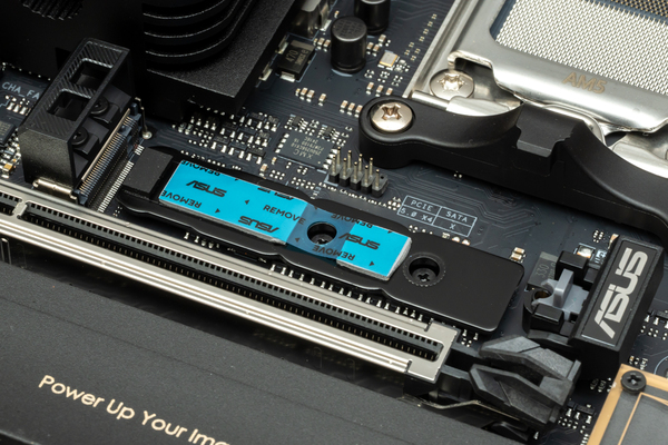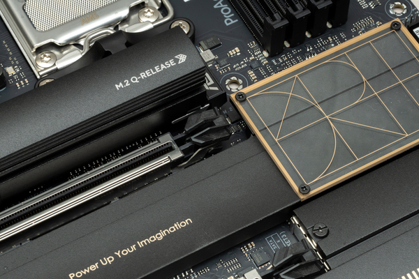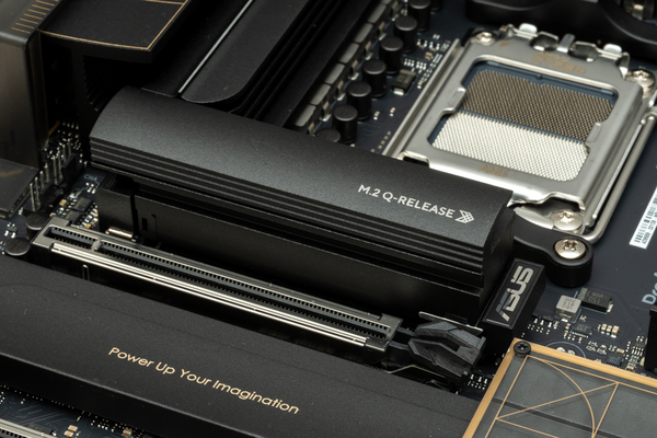 取り付けにひと手間が必要になるM.2拡張スロットから確認していこう。PCIe 5.0×4動作に対応するメインストレージ向けのM.2拡張スロットには、かまぼこデザインのヒートシンクを装備し、「M.2 Q-Release」と「New M.2 Q-Latch」が採用されている。