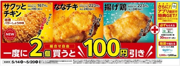 ①1週間限定!「サクッとチキン」、「ななチキ」、「揚げ鶏」いずれか2個購入(組み合わせ自由)で100円引き!