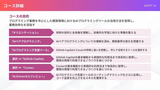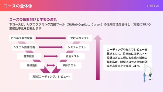 「日本をAI先進国に」を掲げ、利用者数No.1※のAI大学「SHIFT AI」を運営する株式会社SHIFT AI(東京都渋谷区、代表取締役 木内翔大、以下 当社)は、2025年4月14日に開講した「AI Driven エンジニアコース」を2025年5月8日より大型アップデートして提供します。今回のアップデートでは、GitHub Copilotの最新機能であるエージェント機能とAIコードレビューを新たに取り込み、進化したチャット機能とスマートアクションなどに対応したユースケースと演習を追加。エンジニアが“今すぐ現場で使える”実践スキルを最短ルートで習得できる内容へ刷新しました。