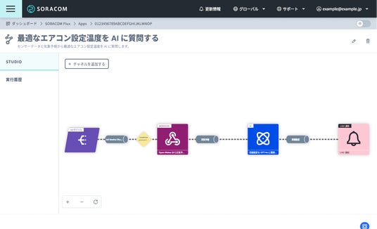 SORACOM Fluxは、IoTシステムの自動化を目的としたIoTアプリケーションビルダーです。センサーやカメラなどのIoTデータをインプットに、通知システムや生成AIモデルによる分析を組み合わせ、現場の業務や設備管理を効率化するアプリケーションを、ソフトウェア開発の専門知識がなくてもブラウザ上で構築できることが特長です。現場主導のデジタル化を支援する仕組みとして、製造業や物流業、小売などさまざまな業界で活用が進んでいます。