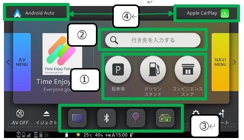 よく利用するカーナビ検索やお好みのAVソースなど4つのキーを自由に配置できます。