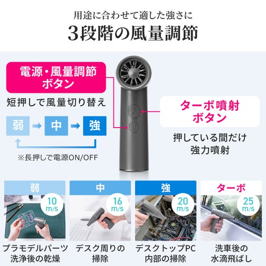 用途に応じて選べる3段階の風量調節に加え、ターボモードも搭載。ターボモードはボタンを押している間、強力な風が分さされるモードになります。キーボードの掃除やエアコンのフィルターまで、用途にあった風量を使い分けて作業ができます。