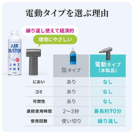 缶タイプのエアダスターはにおいや可燃性があるガスを噴射するため、ガスやゴミなどが出てしまい環境にも悪いですが、電動タイプだと可燃性のガスは出ないためにおいもなく、ゴミも出ないため環境にもお財布にも優しいです。