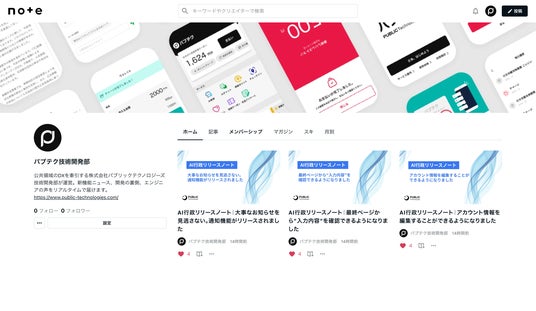 「パブテクAI行政」の最新の導入事例やアップデートに関する情報は、下記noteアカウントにて随時お知らせしてまいります。今後の取り組みや導入事例に関する最新情報をいち早く入手したい自治体関係者の皆様は、ぜひ公式noteアカウントをフォローしていただきますようお願いいたします。