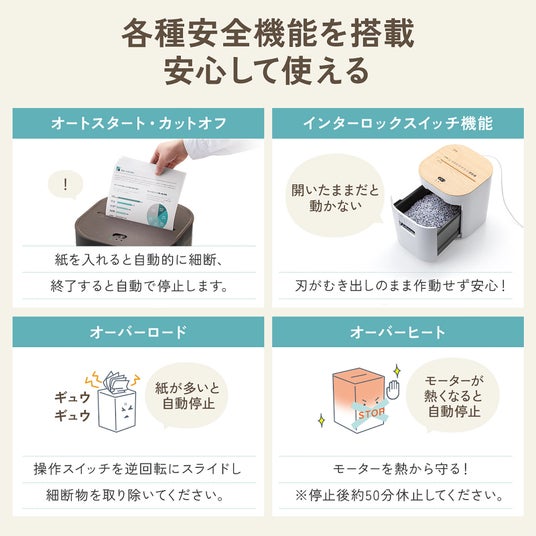 紙を投入するだけで自動で細断がスタートし、終わると自動でストップ。安全性を高めるインターロックスイッチ付きで、ダストボックスの誤セット時には作動しない安心設計。モーター保護機能で長く快適に使えます。