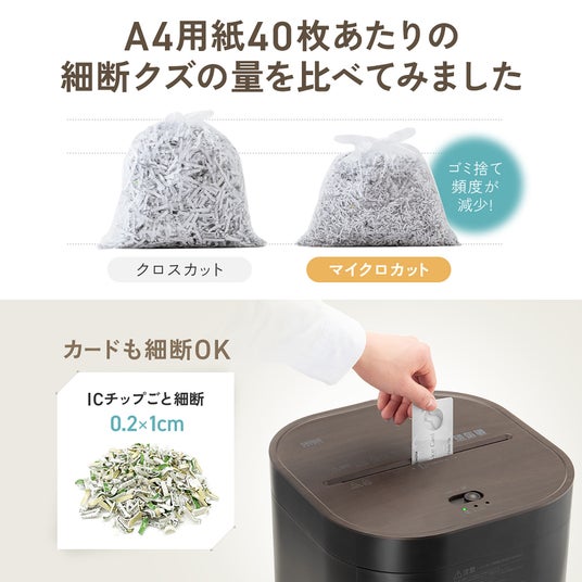 個人情報や機密文書の処分には、細断の細かさが鍵。2×10mmのマイクロカット方式を採用しており、情報漏えい対策として安心。クレジットカードやプラスチック製の会員証なども細かく裁断できるので、書類以外の処分にも対応可能です。