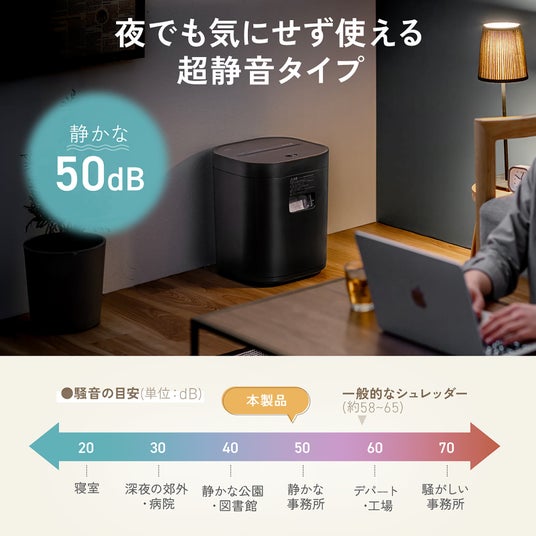 在宅ワークやオフィスでも「音」が気になる場面は多いもの。本製品は約50dBの静音設計で、電話応対や会議中でも気兼ねなく使用できます。シュレッダー特有の大きな駆動音がなく、周囲への配慮を求められる環境に最適です。