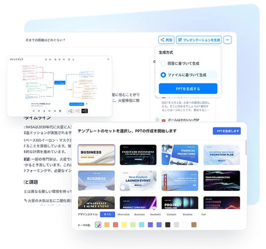 検索結果を基にスライド、マインドマップ、PDFなどをワンクリックで自動生成。数百種のテンプレートに対応