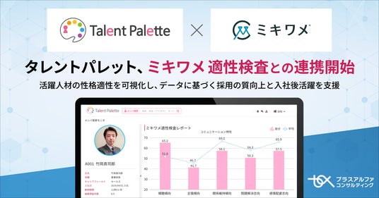株式会社プラスアルファ・コンサルティング(以下:PAC)は、人的資本経営や健康経営、働き方改革やリモートワーク、人材の採用難や離職防止などを目的に、多くのエンタープライズ企業で導入が進んでいるタレントマネジメントシステム 「Talent Palette(以下:タレントパレット)」 において、株式会社リーディングマーク(本社:東京都港区、代表取締役社長:飯田 悠司、以下:リーディングマーク)の 「ミキワメ 適性検査」 とのシステム連携を開始しました。