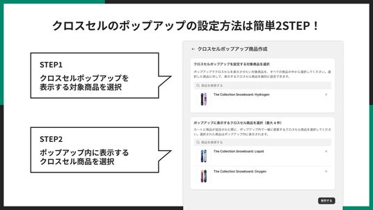 わずか2ステップで完了する、直感的なクロスセルポップアップ設定画面。