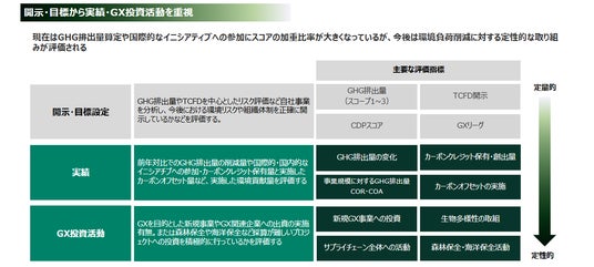 次の段階では、前年からのGHG排出量の増減や事業規模あたりの排出効率(COR・COA)の改善度など、企業が実際に達成した環境パフォーマンスそのものに焦点が当てられ、そして最終的には、新規GX事業への投資、生物多様性保全への取り組み、サプライチェーン全体を巻き込んだ活動、森林保全・海洋保全活動といった、より長期的かつ定性的な視点を含む環境貢献活動が大きく評価されるようになると考えられます。