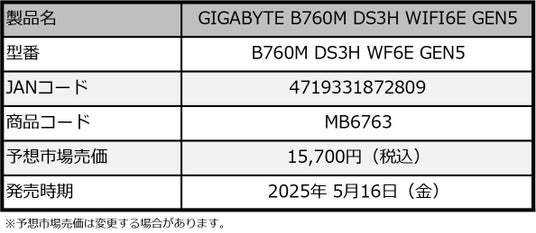 intel B760チップセットを搭載したPCIe 5.0 & W-Fi 6E対応 Micro-ATXマザーボード「GIGABYTE B760M DS3H WIFI6E GEN5」を2025年5月16日(金)に発売いたします。