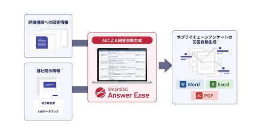 本機能は、AIが導入企業の公開情報や過去のアンケート回答内容などをもとにサステナビリティ・ESG関連アンケートの回答案を自動作成し、作成根拠と共に提示するアシスト機能です。