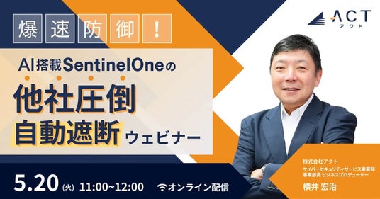 株式会社アクト(本社:東京都文京区、代表取締役CEO 小林 智彦 、以下 アクト)は、巧妙化・高速化するサイバー攻撃に対し、従来の侵入後対応型セキュリティ対策では不十分な現状を踏まえ、このような課題を根本から解決に導く 次世代AI搭載EDR「SentinelOne(センチネルワン)」の、圧倒的な自動防御力を体感できるウェビナーを開催いたします。