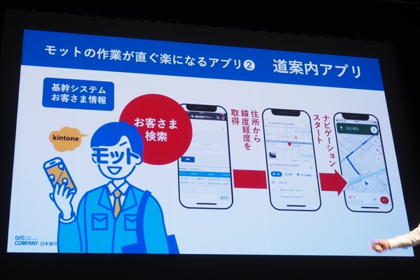 例えば、「受託作業管理アプリ」は、基幹システムの依頼書や指示書のデータを自動連携して、kintone上で管理できるようにするアプリだ。これにより、紙からExcelに転記する作業がなくなった。「道案内アプリ」は、スマホからkintoneに顧客名を入力するだけで、基幹システムの情報から道案内をしてくれるアプリ。わざわざ住所を調べて、カーナビや地図アプリを設定する手間がなくなった。