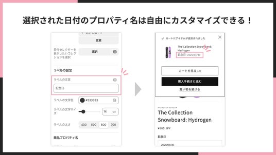 カートや注文履歴に表示される日付項目の名称は、ストアの運用方針に合わせて自由に設定できます。たとえば、「記念日」「納品希望日」など、商品やサービスに応じた適切なプロパティ名を設定することで、顧客にもわかりやすく伝えられます。