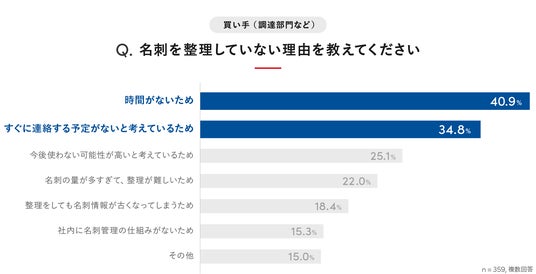 名刺を整理していない理由について聞いたところ、「時間がない(40.9%)」が最も多く、「すぐに連絡する予定がないと考えている(34.8%)」が上位になりました。名刺の管理に手間がかかることで優先度が下がり、渡した名刺の多くが管理・活用されていないことがうかがえる結果となりました。