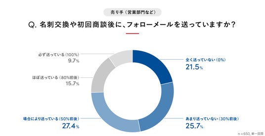 ・売り手(名刺を渡す営業部など)で名刺交換や商談後に必ずフォローメールを送っているのは1割未満