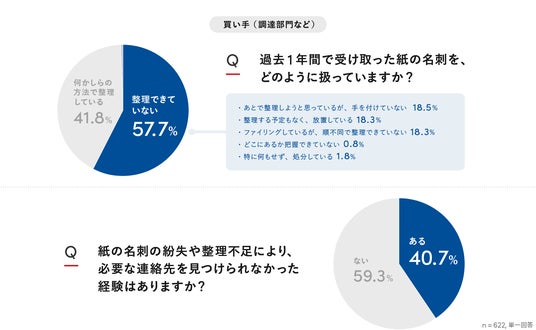 商品・サービスの買い手(購買・調達部など)に対して、他者から受け取った名刺の取り扱い方法を聞いたところ、「あとで整理しようと思っているが、手を付けていない(18.5%)」「整理する予定もなく、放置している(18.3%)」が上位になり、57.7%が整理できていないことが分かりました。また、40.7%が「紙の名刺の紛失や整理不足により、必要な連絡先を見つけられなかった経験がある」と回答し、半数が受け取った名刺を活用できる状態で管理できていないことが明らかになりました。