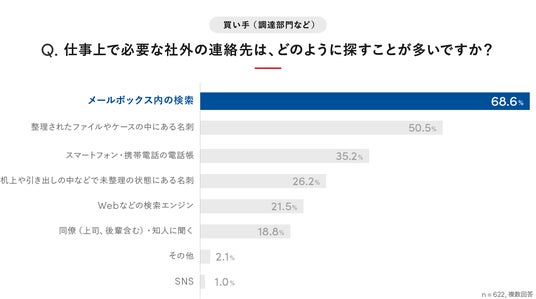 また、仕事上で必要な社外の連絡先をどのように探しているかを聞いたところ、「メールボックス内の検索(68.6%)」が最も多く、次いで「整理されたファイルやケースの中にある名刺(50.5%)」となりました。メールボックスでの検索が日常的になるなかで、紙の名刺を渡して終わりにすることなく、商談後にメールでもフォローすることが、接点を維持するうえで重要であることがうかがえる結果となりました。