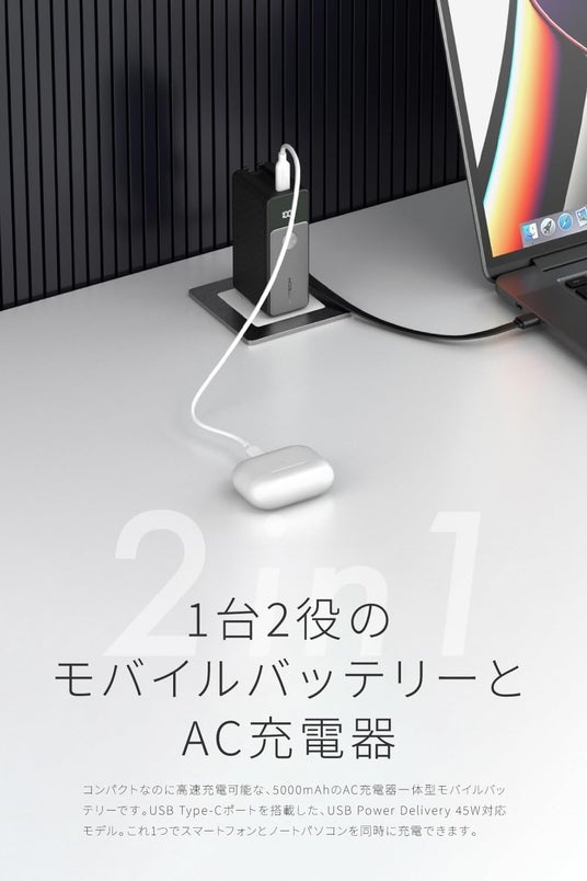 5000mAhのバッテリーを内蔵しながら、コンセントにそのまま挿せるAC充電器機能を搭載。自宅でも外出先でもこれ1台でOK。旅行・出張・カフェワークなど、すべてのシーンで活躍します。