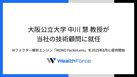 資産運用支援プラットフォームを展開する株式会社MONO Investment(本社:東京都品川区、代表取締役:佐々木 辰/中西 諒、以下「当社」)は、AIファクター解析エンジン「MONO FactorLens(モノ・ファクター・レンズ)」を2025年8月に提供開始することを発表いたします。併せて、本エンジンの開発監修にあたり、大阪公立大学 経営学研究科 教授 中川 慧 氏が技術顧問に就任したことをお知らせいたします。