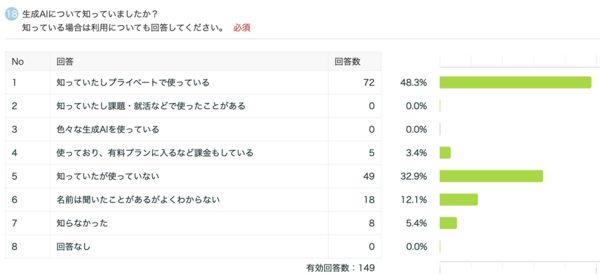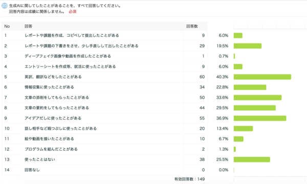 「英訳、翻訳などをしたことがある」(40.3%)、「アイデア出しに使ったことがある」(36.9%)、「文章の添削をしてもらったことがある」(33.6%)、「文章の要約をしてもらったことがある」(29.5%)、「情報収集に使ったことがある」(22.8%)など、学生らしい使い方が多かった。
