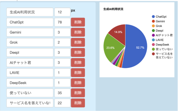 生成AIの利用についてはここ数年、毎年受講生を対象にアンケートをとっているが、年々利用率が高くなっている。使いこなしている学生もいる一方で、未だに触れていない学生もいる。間違いも多いなどの生成AIの特性を知り、うまく活用できるようになってほしいと思う。