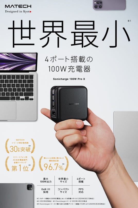 スマートフォン・タブレット関連製品を手がける**MATECH株式会社(本社:京都市下京区、代表取締役:松本 弘暉)は、最大100W出力・4ポート搭載のGaN急速充電器「Sonicharge 100W Pro X」を、デザインを一新して再登場させました。