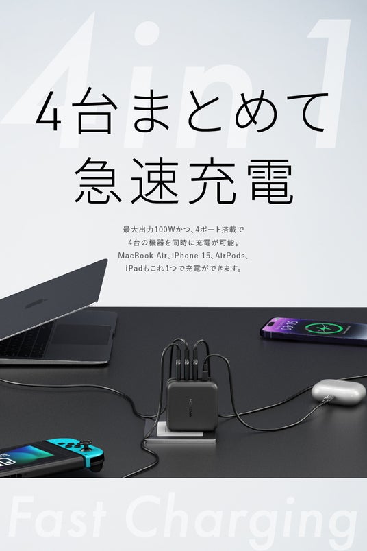USB-C×3ポートとUSB-A×1ポートを備えた4ポート構成ながら、世界最小クラスの筐体に最大100Wの高出力を凝縮。ノートPCを含む最大4台の機器を同時に充電できる設計で、高出力とコンパクトさを両立しました。