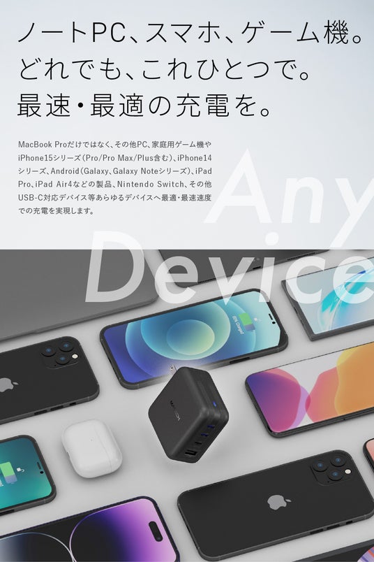 「4ポート・100W」カテゴリにおいて世界最小クラスのコンパクトさを実現しています。