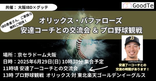 潰瘍性大腸炎・クローン病などの炎症性腸疾患(Inflammatory Bowel Disease:IBD)オンラインコミュニティ「Gコミュニティ」を運営する株式会社グッテ(所在地:東京都千代田区・代表取締役 宮崎拓郎、以下「グッテ」)と大阪府にあるIBD患者会大阪IBD(共同代表:三好和也、布谷嘉浩)は、オリックスグループの協力により、潰瘍性大腸炎・クローン病(IBD)患者を対象として、京セラドーム大阪で開催される野球観戦(オリックス・バファローズ 対 東北楽天ゴールデンイーグルス)の無料招待と潰瘍性大腸炎患者当事者でもあるオリックス・バファローズ安達了一コーチとの交流会を開催いたします。