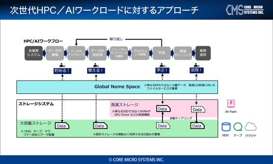 コアマイクロシステムズ株式会社(本社:東京都板橋区、代表取締役社長:高橋晶三、以下コアマイクロシステムズ)は、HPC(ハイパフォーマンス・コンピューティング)およびAIワークロードに最適化されたデータ基盤を構築するためのソリューションストレージ「CMS GpSCALERシリーズ」を発表しました。