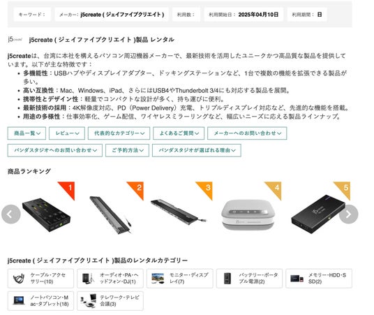 ※パンダスタジオ・レンタルのj5create URL:https://rental.pandastudio.tv/maker/j5create/