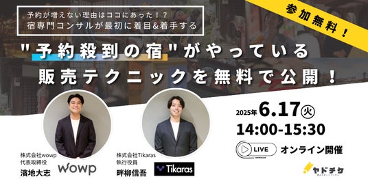 このたび、10,000円から始められる宿泊施設専門のスポットコンサルティングサービス『ヤドチケ』を運営する株式会社Tikarasと株式会社wowpとが共同で「【人手も時間も足りない宿必見!】予約が増えない理由はココにあった!?コンサルが最初に着目&着手する"予約殺到の宿"がやっている(秘)︎テクニックを無料で公開!」を開催します。