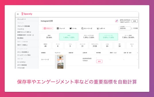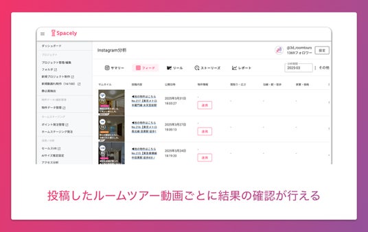360°VRと空間データ(*1)活用プラットフォーム「スペースリー」を運営する株式会社スペースリー(所在地:東京都渋谷区、代表取締役:森田 博和)は、SNSマーケティングが重要視される中、投稿品質のばらつきや効果測定の難しさ、人材・時間不足といった課題を抱える不動産事業者を支援すべく、不動産業界に特化したInstagram分析ツール、およびSNS運用代行サポートプランの提供を開始しました。