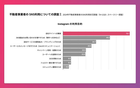 SNSの中でもInstagramの利用率は特に高く、その利用の目的は「集客アップ・問い合わせ増・認知度アップ」となっています。