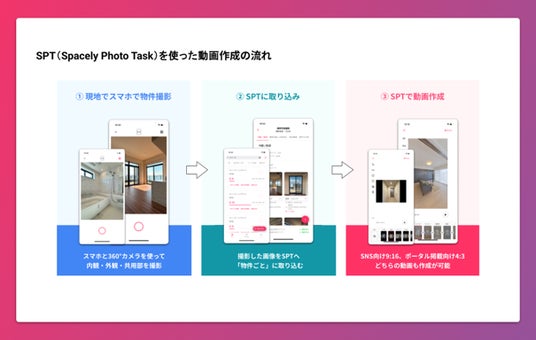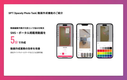 室内写真の撮影を効率的に行うことを目的として開発・提供中のスマートフォンアプリSPT(Spacely Photo Task)に動画作成機能を追加。撮影したパノラマ写真、動画、それ以外の画像を組み合わせた動画作成をSPT上で行うことができます。