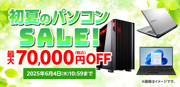 マウスコンピューターは5月14日から6月4日にかけて、同社のECサイトにて「初夏のパソコンセール」を実施する。このセールでは、ノートブックやデスクトップパソコンを中心に、最大7万円(税込)引きの特別価格で提供する。