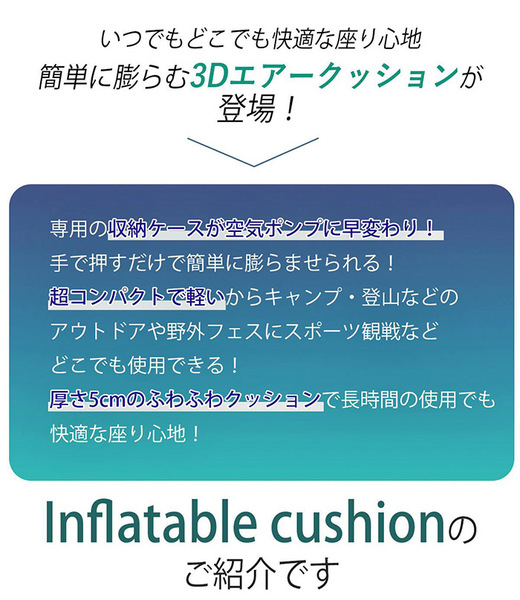 アスキーストアでは、屋内外でどこでも快適に使える「Inflatable cushion」を発売中。このクッションは専用ケースが空気ポンプに変身し、手軽に膨らませることができる革新的なアイテムです。