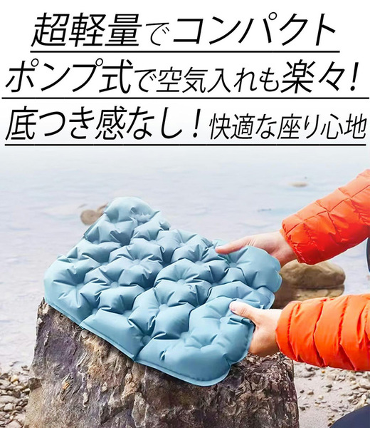 膨らませたときに5cmの厚みを持つクッションは、底つき感なく快適に座れる設計。40DナイロンとTPU生地を使用し、高い耐久性を誇ります。