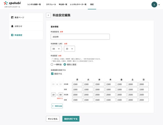 - スクール機能との連携:既にスクール機能を導入している施設は、レンタル施設の設定を行う際にコートやスタジオなどレッスン利用している施設を連携できる