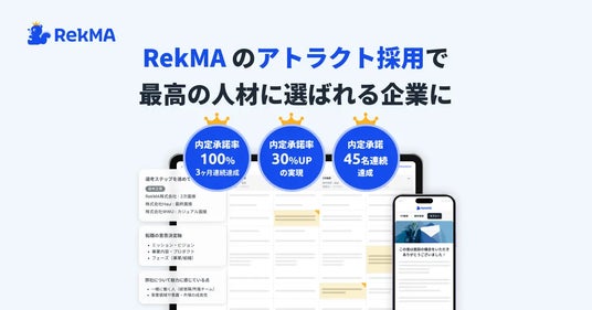 KINTOテクノロジーズは、クルマのサブスクリプションサービス「KINTO」のプロダクト開発を通じて、モビリティ業界に新たな価値を提供しています。近年、事業の拡大に伴い採用数が増え、エンジニアやデジタル人材を含めた増員が急務となっていました。こうした課題に対応するため、同社はRekMAを導入し、候補者1人ひとりに最適化したアプローチで、採用決定率の最大化を図ります。さらに、候補者の意向を早期から把握し、候補者視点での面接官へのフィードバックを回収・活用することで、採用活動全体の質を高めていきます。