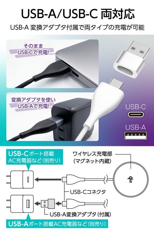 ● 1.5mのUSB-Cケーブル直結タイプ。USB-A変換アダプタ付きでUSB-Aポート搭載のUSB電源でも使用可能