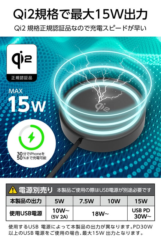 ※電源別売り。本製品のご使用にはUSB電源が別途必要です。最大15Wの出力にはUSB PD 30W以上のUSB電源が必要となります。ご使用のUSB電源の出力により、本製品の最大出力が変わります。