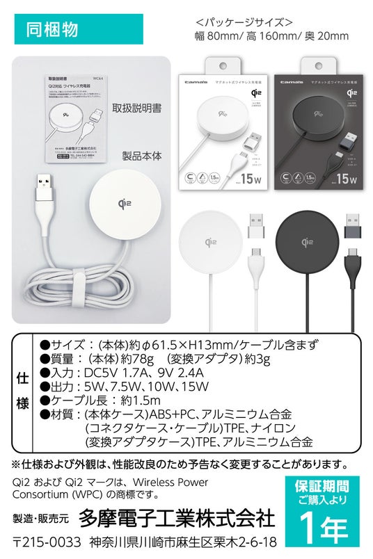 多摩電子工業株式会社(本社:神奈川県川崎市、代表取締役 執行役員社長 杉山一)は、最新のQi2規格に対応したマグネット式ワイヤレス充電器を2025年5月14日にECストアにて発売します。カラーは、ブラック(PR-WC64K)、ホワイト(PR-WC64W)の2色展開、価格はいずれも3,480円(税込・送料込)です。
