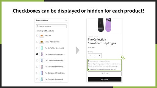 「UR: Age Confirmation Checkbox App」では、商品ごと年齢確認のチェックボックスを表示するかどうかを設定できます。年齢確認が必要な商品と必要ない商品が混在しているストアの方も問題なく利用することができます。
