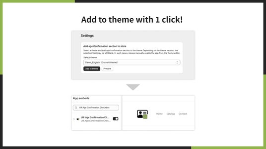 「UR: Age Confirmation Checkbox App」では、年齢確認機能を1クリックでテーマに追加できます。難しい操作は必要ないので、誰でも簡単にアプリを始められます。