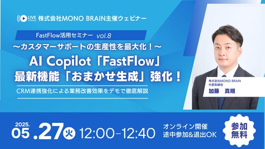 カスタマーサポート(CS)領域のAIソリューションを提供する株式会社MONO BRAIN(本社:東京都渋谷区、代表取締役:加藤真規)は、2025年5月27日(火)12時より、無料オンラインウェビナー「AI Copilot「FastFlow」最新機能ウェビナー (vol.8)」を開催いたします。
